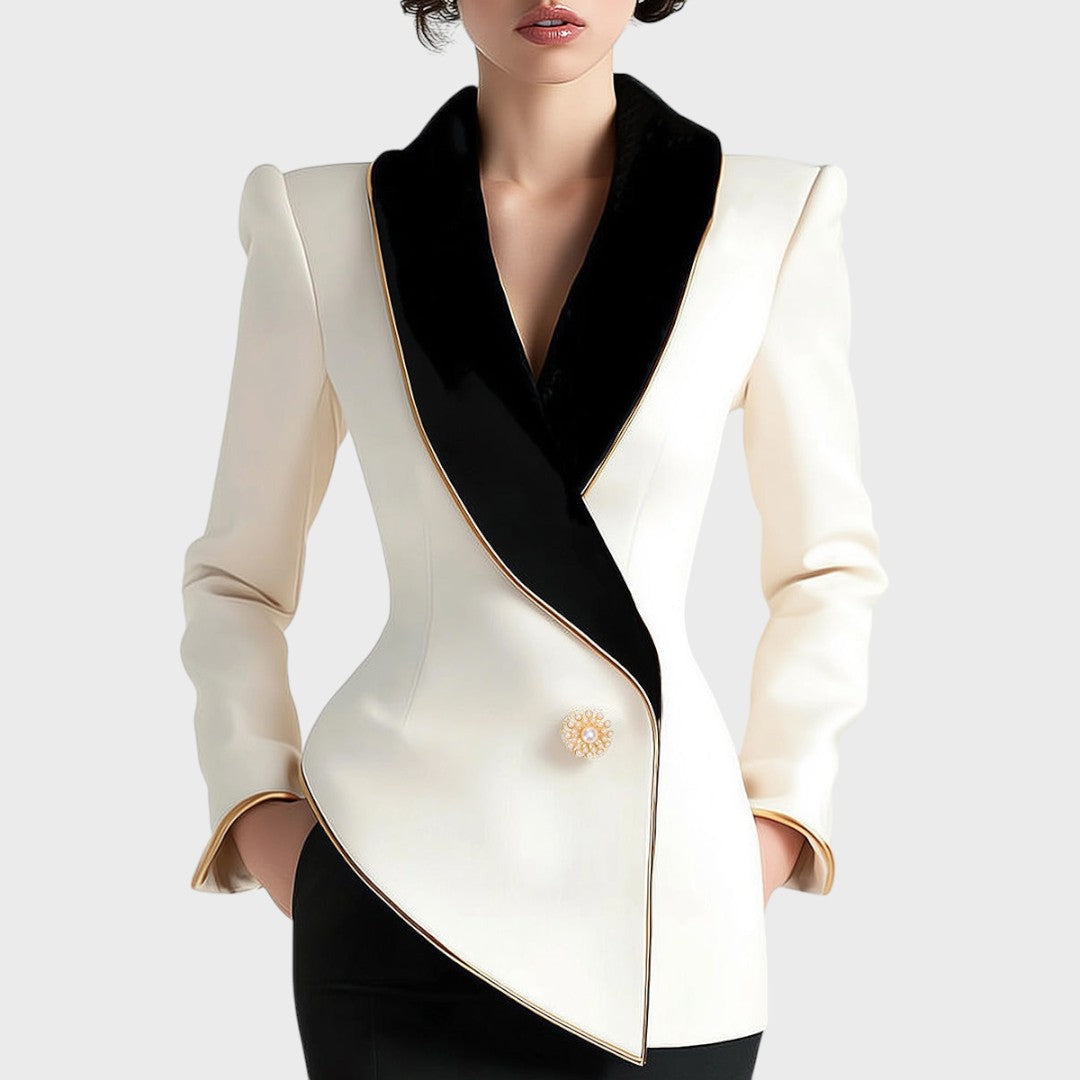 Sklad | Elegantni asimetrični bijeli blejzer s crnim reverima u kontrastu