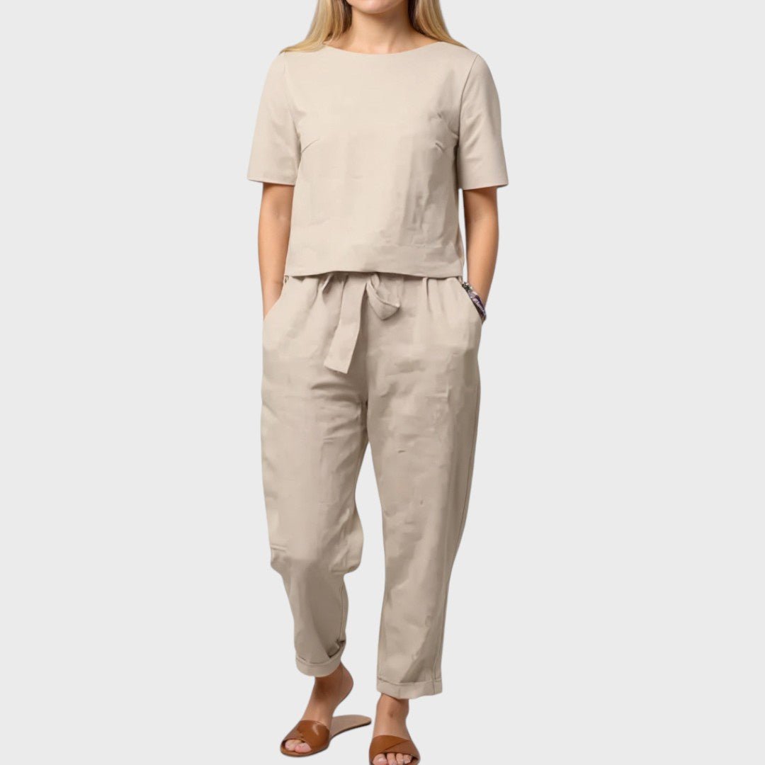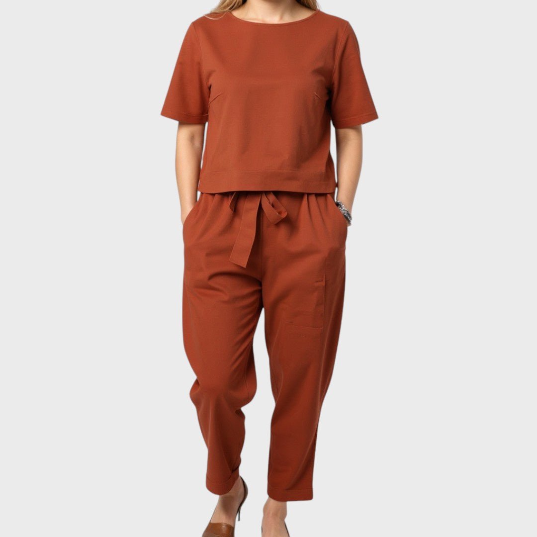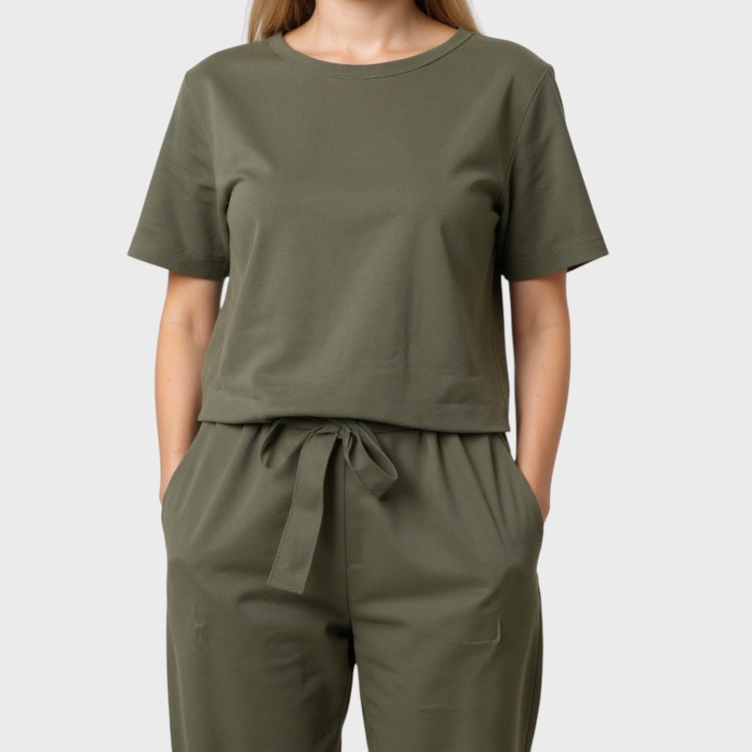 Komplet Dubrovka stvoren je kako bi spojio svježinu, modernost i praktičnost u svestranom dvodijelnom izgledu. U elegantnoj kaki nijansi, kombinira laganu bluzu s okruglim izrezom i kratkim rukavima s ležernim i udobnim hlačama, nudeći neopterećenu sofisticiranost za najtoplije dane.