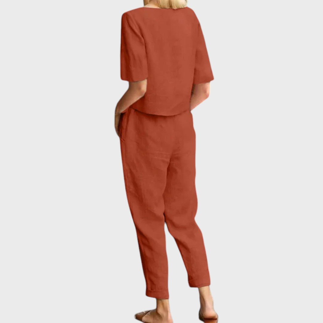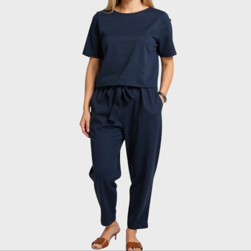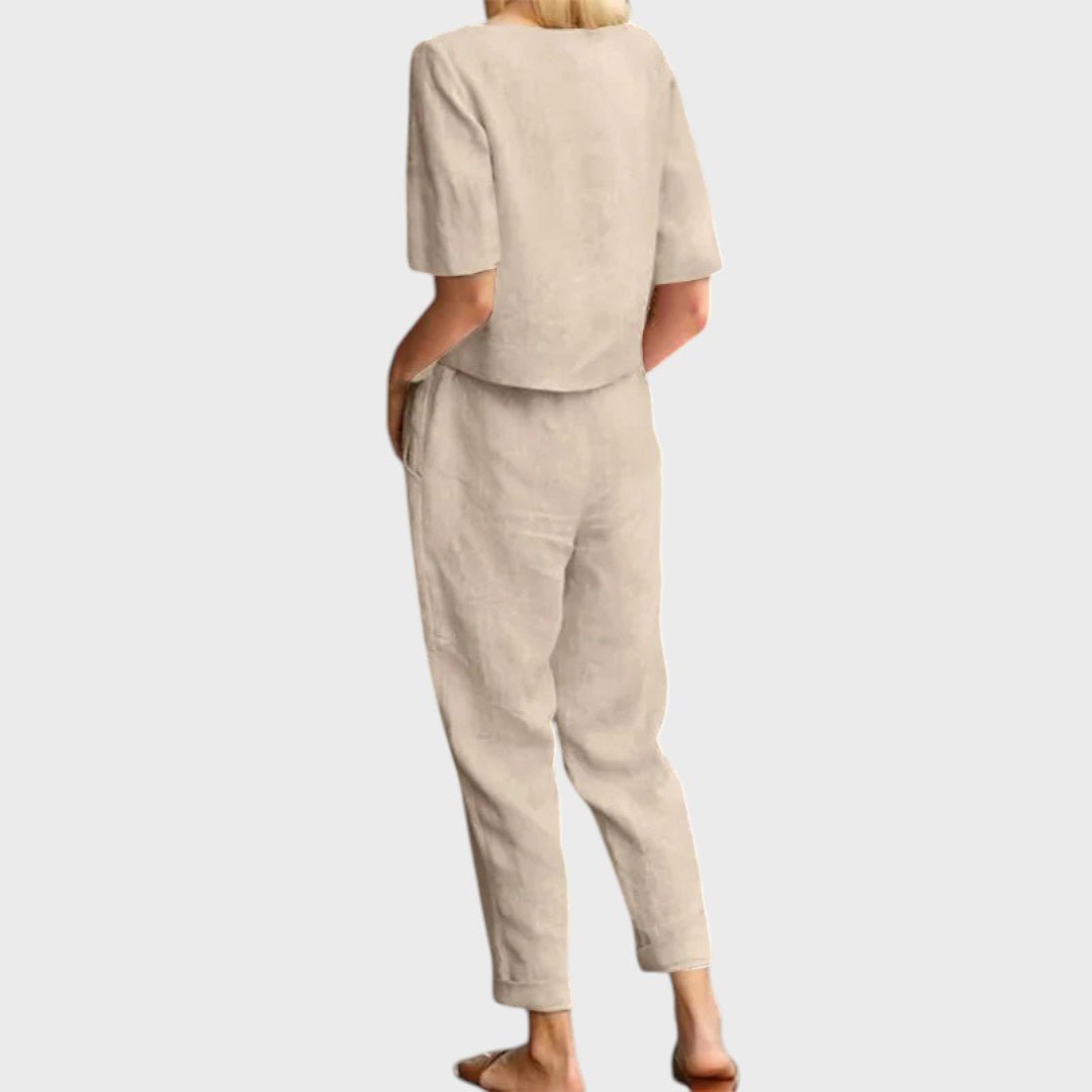 Komplet Dubrovka stvoren je kako bi spojio svježinu, modernost i praktičnost u svestranom dvodijelnom izgledu. U elegantnoj kaki nijansi, kombinira laganu bluzu s okruglim izrezom i kratkim rukavima s ležernim i udobnim hlačama, nudeći neopterećenu sofisticiranost za najtoplije dane.