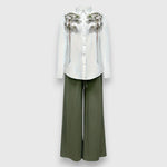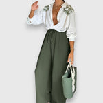 Usklađuje profinjenu bluzu s nježnim cvjetnim motivom i lepršave hlače sa širokim nogavicama — savršeno za stilizirane dane. Dvobojna igra tonova i visoki ovratnik daju ženstvenu, dotjeranu notu, dok lagana tkanina osigurava udobnost od jutra do večeri.
