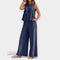 Monokromatski dvodijelni set koji odiše samopouzdanjem i ženstvenošću. Bezrukavni, opušteno krojen top spaja se sa širokim palazzo hlačama za ležeran stil i svakodnevnu udobnost. Lagan, prozračan materijal ugodan je na koži — idealno za tople proljetne i ljetne dane.