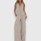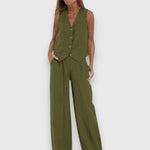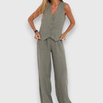 Set koji spaja ljetnu prozračnost i jednostavnu profinjenost. Bezrukavni top užeg kroja naglašava ženstvenu liniju, dok opuštene hlače daju slobodu pokreta i ugodu u najtoplijim danima. Moderan, laskav spoj za svaku ljetnu priliku.