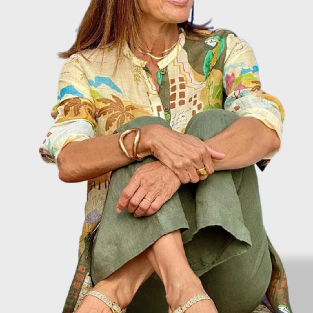 Fluidnost, lakoća i opuštena sofisticiranost definiraju komplet Kristina™. Izrađen od prirodnog lana, s dizajnom inspiriranim tropskim duhom, ovaj look savršen je izbor za sunčane dane, druženja na otvorenom ili putovanja sa stilom. Košulja s uzorkom i hlače širokog kroja stvaraju ravnotežu između udobnosti i šarma koji ne prolazi nezapaženo.