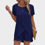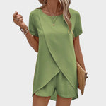 Ovaj moderan komplet sastoji se od lagane bluze s asimetričnim preklopom i udobnih kratkih hlača koje zajedno stvaraju sofisticiran, ali opušten izgled. Prozračan materijal osigurava udobnost čak i u najtoplijim danima, dok elegantan kroj naglašava figuru bez narušavanja slobode kretanja. Idealno za šetnje, putovanja, druženja ili ležerne ljetne večeri.