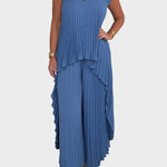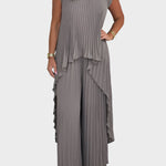 Osvježite garderobu ovim sivim plisiranim setom koji spaja fluidan pad, udobnost i diskretnu eleganciju. Asimetrični top midi dužine s kratkim rukavima skladno se spaja sa širokim hlačama s elastičnim strukom, stvarajući profinjen izgled za sve od svečanijih izlazaka do svakodnevnog “luksuza bez napora”.