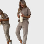 - Kratka majica + hlače s elastičnim strukom i vezicom — praktično pristajanje uz džepove za svakodnevne potrebe.