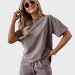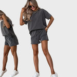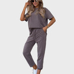 Udoban pamučni set u neutralnim tonovima koji spaja jednostavnost i stil. Kratka majica i hlače opuštene linije s elastičnim strukom pružaju slobodu kretanja, dok minimalistički pristup osigurava dotjeran, svakodnevan izgled.