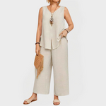 Opušten i profinjen set koji spaja čiste linije s modernim karakterom. Bezrukavni top s diskretnim prednjim prorezom i široke hlače stvaraju izgled koji odiše udobnošću i stilom. Lako se kombinira sa sandalama ili espadrilama, a slamna torbica daje suptilan boho dojam.