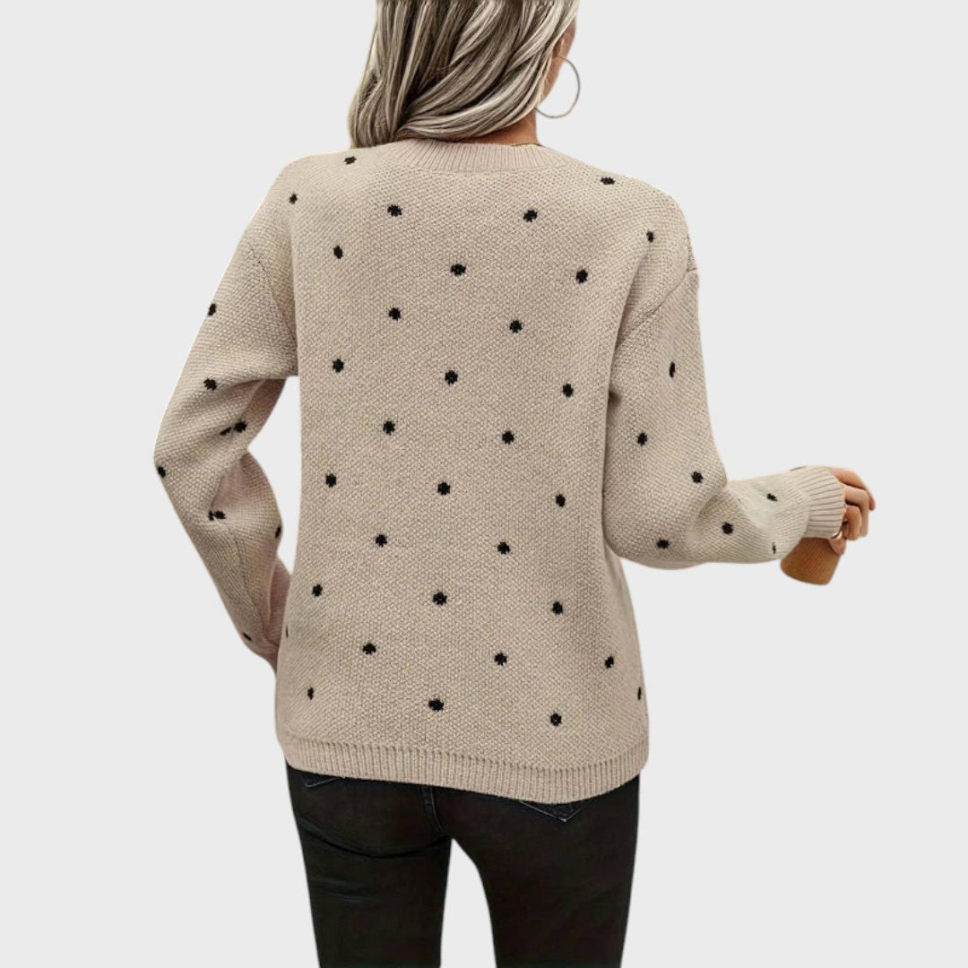 Nina pleteni pulover na točkice spaja bezvremensku razigranost s ugodnom toplinom. Izrađen od kvalitetne, prozračne tkanine, grije bez pregrijavanja – savršen za prohladne proljetne dane, jesen ili zimu. Sa svojim šarmantnim uzorkom točkica i klasičnim okruglim izrezom, Nina donosi svježinu u tvoju garderobu i uklapa se u svaku priliku.