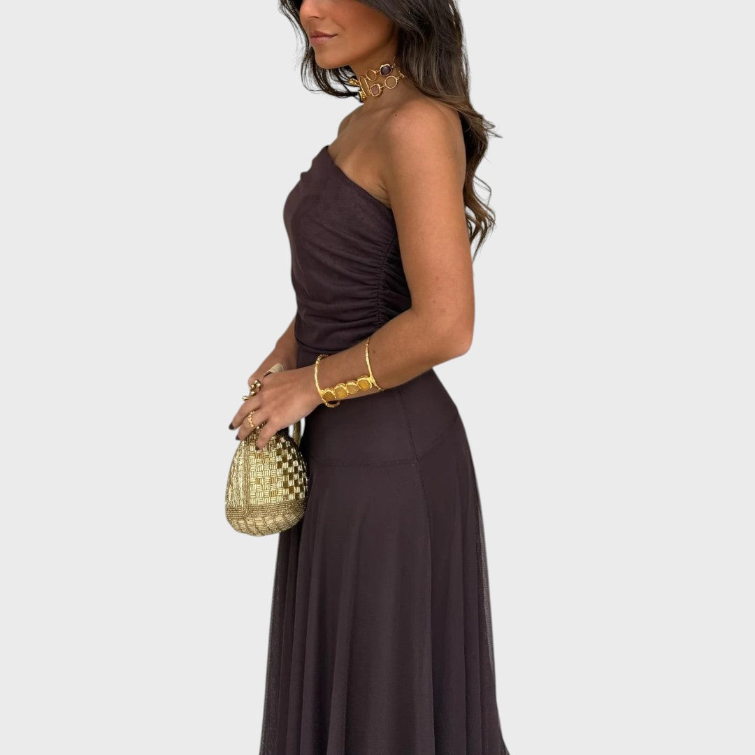 Zorica spaja eterealnu eleganciju i moderan romantični šarm. Sa svojim lepršavim krojem, ravnim izrezom i nježno drapiranim gornjim dijelom, ovaj maksi model naglašava ženstvenu siluetu i pruža bezvremenski izgled. Prozračan šifon čini ga savršenim izborom za tople dane i ljetne večeri.